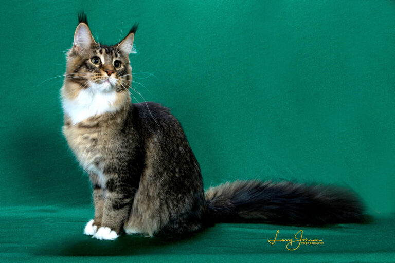 Luna is a beautiful brown (black) ticked tabby and white Maine Coon bred by Teri Matzkin of SaraJen. She is affectionate and companionable. With a watchful eye, and always looking for a lap, she oversees and assists with most of our household activities. We have shown her in both TICA and CFA. In 2024 she was TICA’s International Best Brown (Black) Ticked Tabby/White Maine Coon of the Year, a title she also received in TICA’s Mid-Atlantic region. She has been genetically cleared (N/N) for PK Deficiency, Spinal Muscular Atrophy and the MYPCP3 mutation for Hypertrophic Cardiomypathy. Echocardiograms on March 14, 2024 and March 22, 2025 found her heart healthy, with no issues.