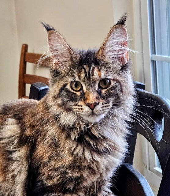 Acadia is a brown classic torbie and was born in March, 2025. She is inquisitive and outgoing, much like her mother, Monterini Koko of Cooncraft. Acadia’s sire is Pimacoon Apache Chief of Cooncraft and she inherited his very sweet expression and big eyes. She has been genetically cleared (N/N) for PK Deficiency, Spinal Muscular Atrophy and the MYPCP3 mutation for Hypertrophic Cardiomypathy.